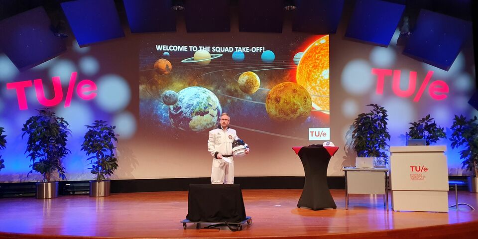 Vooraf mochten de vier directeuren van de diensten aan gastheer Barry Fitzgerald vertellen hoe ver ze zijn met het vormgeven van SQUAD. Dat schommelt tussen inventarisatiefase (GA) tot complete roadmappen (ESA). In ruimtevaartpak nodigde de host de directeuren uit te zeggen wat zij zien als de bestemming voor de TU/e. De doelstelling van deze ochtend gaf CvB-vicevoorzitter Patrick Groothuis al: “Vraag jezelf af hoe we goede dienstverlening voor een goede prijs kunnen leveren aan de TU/e.”