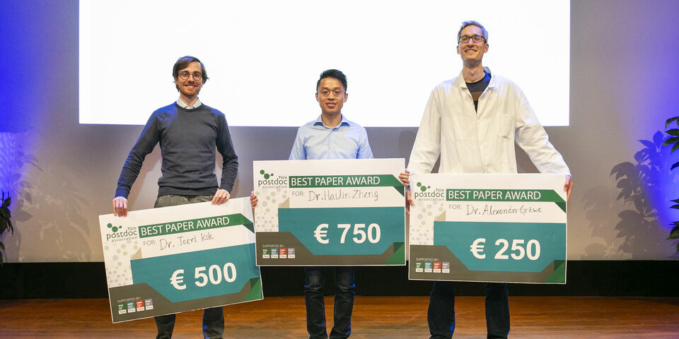 Heel even wordt het doorzichtige buisje in de hand van postdoc Alexander Gräwe fluorescerend blauw. Gehuld in een ietwat gekreukelde witte labjas staat hij op het podium van de Blauwe Zaal in het Auditorium. Gräwe is een van de zeven postdocs die dit jaar meedingen naar de Postdoc Best Paper Award. De Postdoc Association reikt deze voor de vierde keer in hun bestaan uit, een initiatief in samenwerking met de vier TU/e onderzoeksinstituten - ICMS, EAISI, EIRES en EHCI. De sponsoring rouleert tussen de verschillende instituten; dit keer neemt Eindhoven Hendrik Casimir Institute de organisatie voor haar rekening.