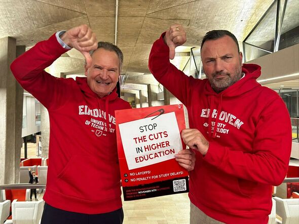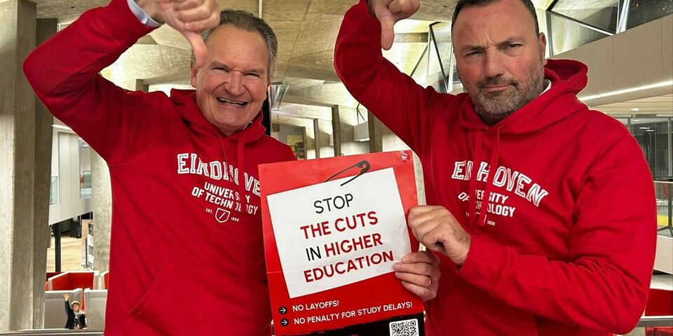 Nadat gisteren naar buiten kwam dat het protest tegen de bezuinigingen op het hoger onderwijs niet door zou gaan, beraden de universiteiten zich vandaag op een alternatief. UNL heeft de universiteiten daartoe opgeroepen. TU/e-collegevoorzitter Robert-Jan Smits en vice-voorzitter Patrick Groothuis sturen vast een foto de wereld in om te laten weten hoe ze denken over de bezuinigingen.