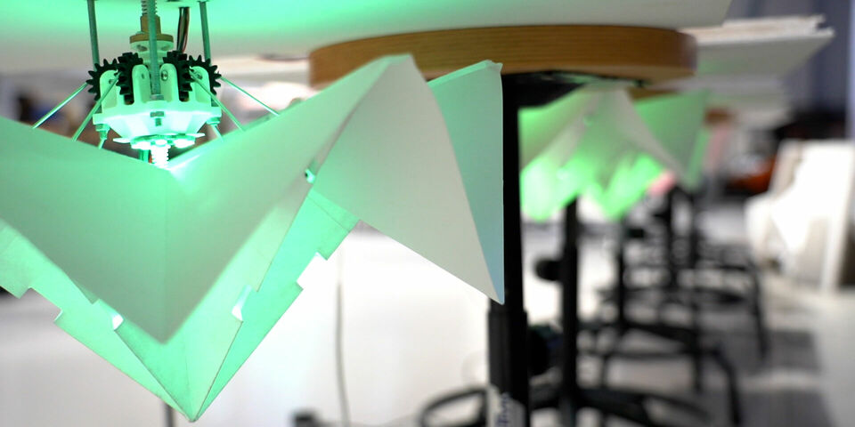 Het is al donker buiten, wanneer vier masterstudenten van het vak ISP: innovation through art & design bij innoSpace de laatste hand leggen aan hun kunstinstallatie. Met ducttape plakken ze papieren origamivormen aan een soort kurkentrekker-mechanisme, dat de vormen met een motortje in en uit zal klappen. Ondertussen test Olivier Blom van Team IGNITE - die de studenten bij hun project ondersteunt - of de aansluitingen werken en de papieren vormen in de juiste kleur oplichten.