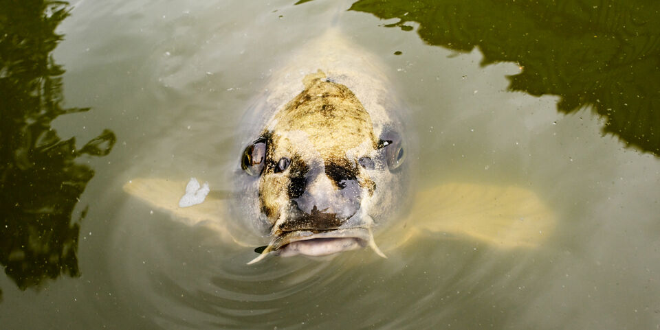 “De nieuwe vijver kent namelijk aan de zijkant natuurlijke vegetatie, waardoor Egbert meer eiwitrijk en gevarieerd voedsel binnenkrijgt, in de vorm van bijvoorbeeld wormpjes, insecten en planten. Er is bovendien meer watervolume.” Overigens is Egbert niet té dik. “Hij lijkt misschien te dik voor leken, maar als koi-expert zie ik veel karpers, en deze is echt niet te dik.”