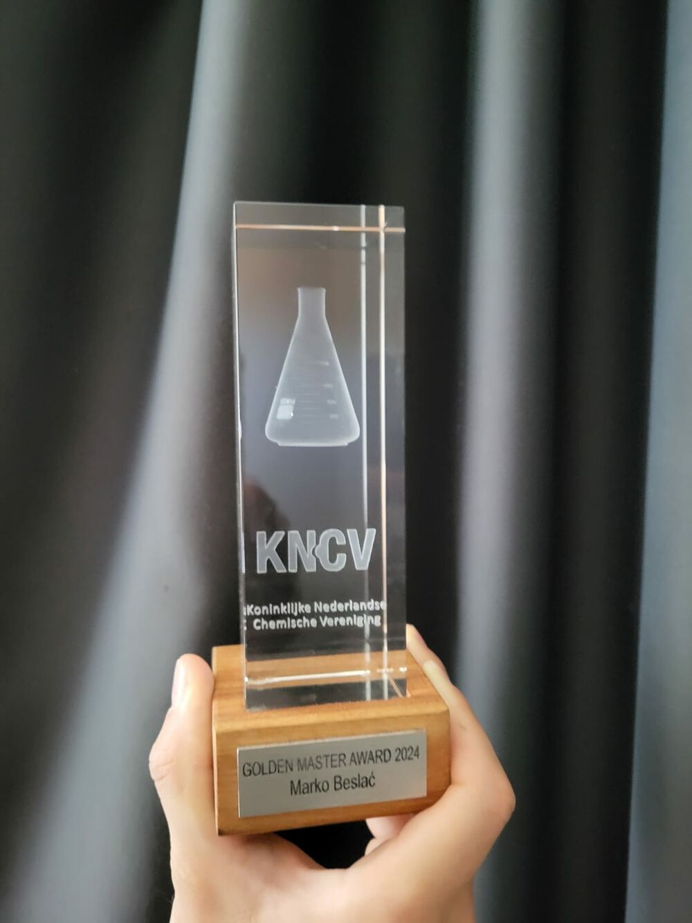 Beslać kreeg de prijs van De Koninklijke Nederlandse Chemische Vereniging (KNCV) voor zijn onderzoek getiteld ‘Triazatruxene-based supramolecular polymers’. Al moest hij daar wel even op wachten. Vijf maanden lang wist hij al dat hij tot de drie genomineerden behoorden, maar vorige week donderdag kreeg hij pas het verlossende woord tijdens De Avond van de Chemie. Zijn ouders waren erbij, afgereisd uit Servië. “Die avond hebben we wat drankjes gedronken en de dag erna hebben we een mooi familiediner gehad om het te vieren.”