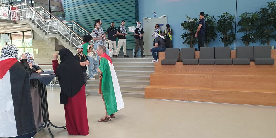 De demonstranten hadden vandaag tot doel de gasten van OAY te informeren over de banden van de TU/e met Israël en te laten zien en horen dat ‘Eindhoven Students 4 Palestine’ aanwezig is.