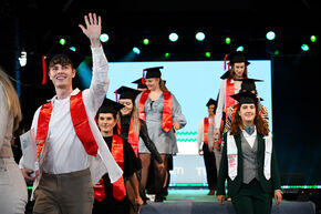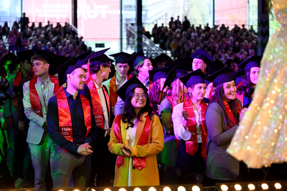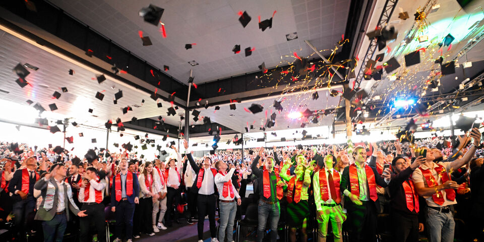 Geen toga’s, maar wel weer honderden vliegende hoedjes dit jaar tijdens MomenTUm. Het feestelijke afstudeermoment werd zoals gewoonlijk gevierd in de Markthal met energieke optredens, boegeroep vanwege de onderwijsbezuinigingen en harde deuntjes van DJ Kit-T.