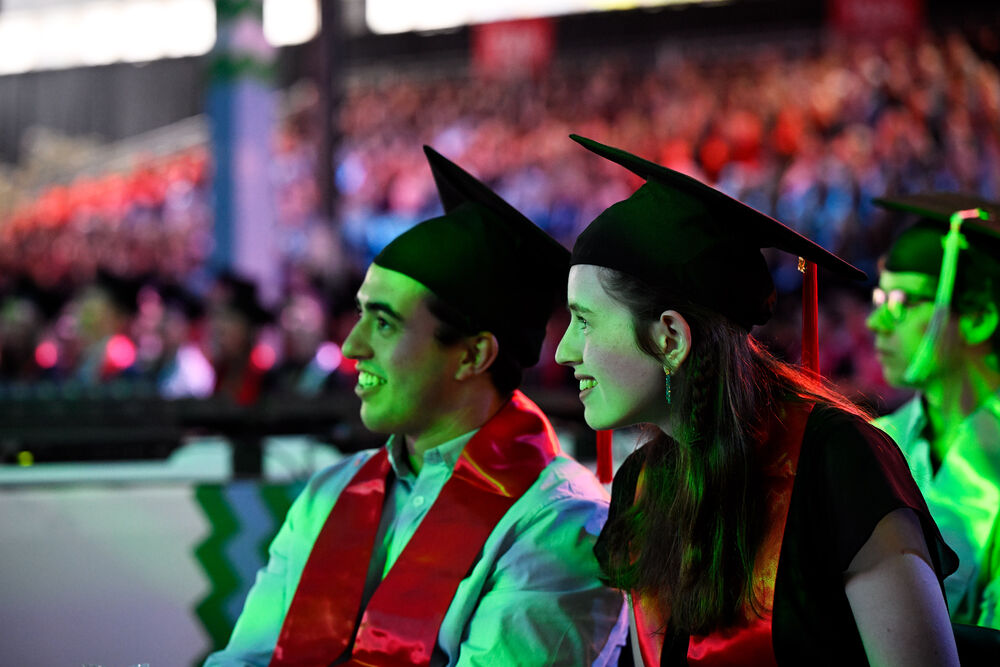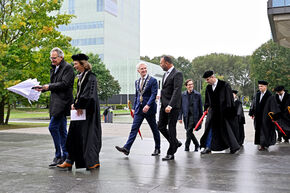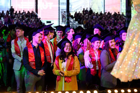 Ook Silvia Lenaerts sprak de studenten toe. “Je hebt het gehaald. We zijn erg trots op jullie. Nu kun je je eigen weg gaan. Je kunt hier doorgaan of met een baan beginnen of iets heel anders gaan doen. Doe iets waar je gelukkig en comfortabel van wordt.” De rector magnificus deelde daarna de nieuwe kernwaarden (Curious, Open, Responsible, Respectful, ofwel ‘CORe’) van de universiteit, waarvan ze hoopt dat de studenten die ook na hun afstuderen zullen uitdragen. Ze sloot af met de woorden van socioloog Marshall McLuhan. “There are no passengers on spaceship Earth. We are all crew.” Oftewel, we dragen allemaal verantwoordelijkheid voor onszelf en voor elkaar.