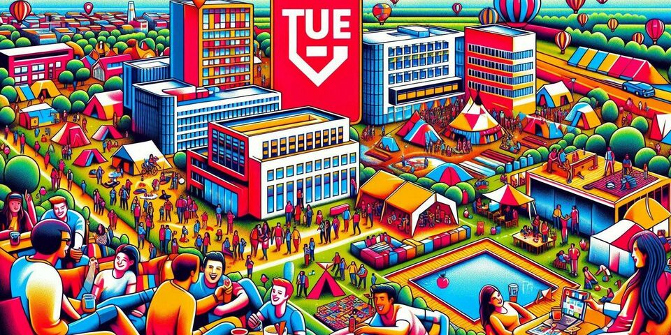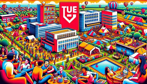 “Make an artistic, colorful image of the introduction week for new students at Eindhoven University of Technology. The following things have to be represented in the image: Logo TU/e in red, a rectangular pond, camping, festival, friendship, diversity, workshop, modern university buildings.”
