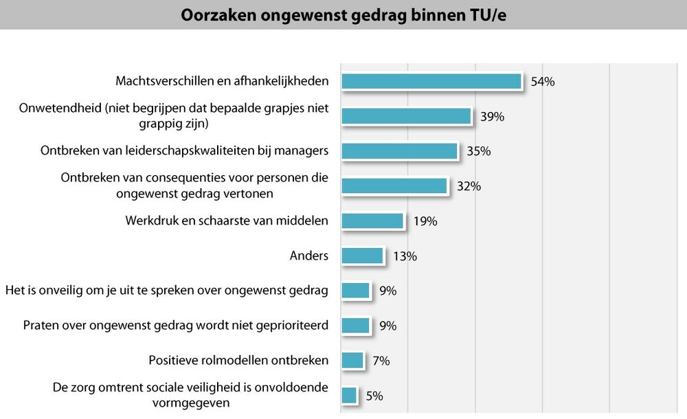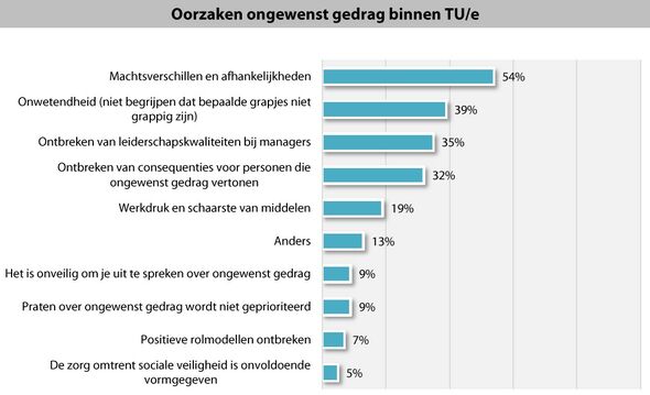 De meest genoemde oorzaken van ongewenst gedrag zijn machtsverschillen en afhankelijkheden (54 procent), onwetendheid (39 procent), ontbreken van leiderschapskwaliteiten bij managers (35 procent) en het uitblijven van consequenties voor personen die ongewenst gedrag vertonen (32 procent).