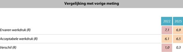 Op een schaal van 1 (geen werkdruk) tot 10 (extreem hoge werkdruk) scoort het WP bij de ervaren werkdruk een 7,1, terwijl de acceptabele werklast een 6,7 krijgt. Bij het OBP is dat respectievelijk een 6,6 en een 6,3. In 2022 gaf het WP de ervaren werkdruk een 7,3 en de acceptabele werkdruk een 6,4. Bij het OBP was dat respectievelijk 6,9 en 5,8. Dit betekent dat de ervaren werkdruk bij zowel het WP als het OBP iets lager is dan drie jaar geleden, maar dat de acceptabele werkdruk enigszins is gestegen.