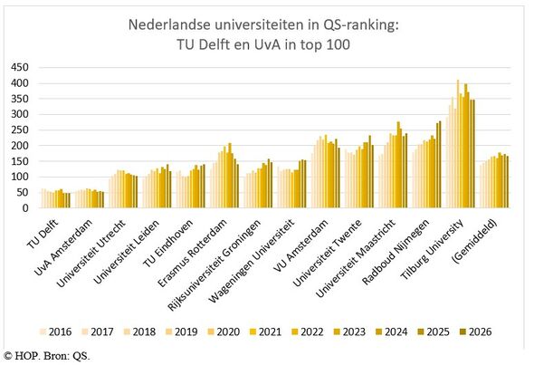 Door de jaren heen verloren de Nederlandse universiteiten gemiddeld steeds wat terrein in de ranglijst, al bleven de TU Delft en de Universiteit van Amsterdam altijd goed scoren. Maar dit jaar hebben negen van de dertien universiteiten zich verbeterd. De TU/e is voor het tweede jaar op rij iets gezakt in QS-wereldranglijst. Toch staat ze nog altijd op plek 5 van Nederlandse universiteiten.