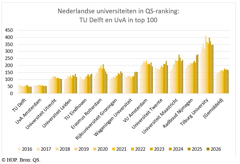 Negen van de dertien Nederlandse universiteiten boeken terreinwinst in de wereldranglijst van onderzoeksbureau QS. Koplopers TU Delft en de Universiteit van Amsterdam handhaven zich rond plaats 50. De TU/e is voor het tweede jaar op rij iets gezakt in QS-wereldranglijst.