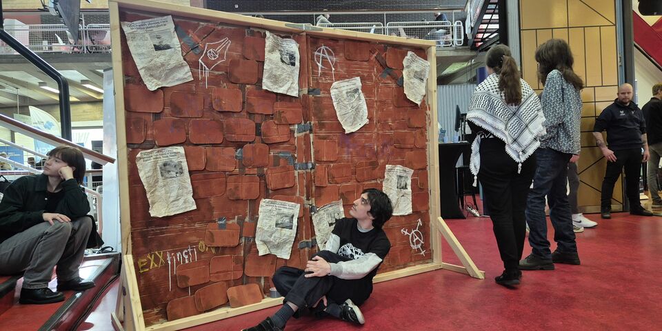 Masterstudent Computer Science Eduardo Costa Martins heeft het kunstwerk bedacht en wil daarmee aandacht vestigen op de mening van University Rebellion (UR). Met mededemonstranten zette die een groot scherm in elkaar. “Deze kant (zie hoofdfoto, red.) noem ik Dystopian Alley. Je ziet hoe de toekomst eruitziet als we niet stoppen met het gebruik van fossiele energie. Maar de krantenberichten die we erop plakten laten zien dat het niet alleen toekomst is, maar ook al realiteit.”