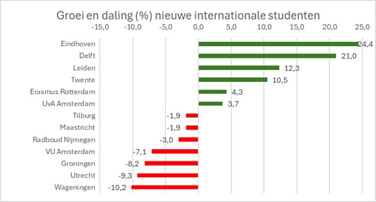 De groeipercentages verschillen echter flink per instelling. Zo verwelkomden de TU/e en TU Delft dit collegejaar juist aanzienlijk meer nieuwe internationale bachelor- en masterstudenten: respectievelijk 24 en 21 procent. In Wageningen daalden de aantallen juist met 10 procent.