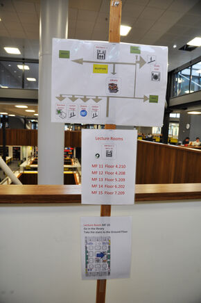 Mijn eerste ervaring blijkt helaas symbolisch voor de manier waarop het gehele gebouw is voorzien van bewegwijzering. Bordjes missen: naar sómmige collegezalen is een looproute, maar een drukbezochte studievereniging als GEWIS is nog steeds alleen te vinden voor wie de getapete A4'tjes op de muren volgt. Wie naar bureau computerfaciliteiten moet, kan het beste vooraf thuis vast het kamernummer opzoeken, want ook een instantie als die was blijkbaar niet belangrijk genoeg.