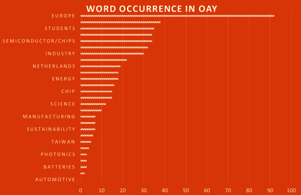 Die relevantie drukt zich vooral uit in halfgeleiders. Beter bekend als chips. Het is niet voor niets dat dit woord tijdens de ceremonie bijna even vaak viel als het woord student (zie het staatje boven). Peter Wennink, de topman van ASML, ziet het aantal studenten het liefst verviervoudigen om aan de arbeidsvraag van alleen al zijn bedrijf te kunnen voldoen. De industrie vraagt, wij draaien schijnt het motto te zijn achter de schaalsprong. De grote vraag is echter hoe we die nieuwe studenten gaan huisvesten.