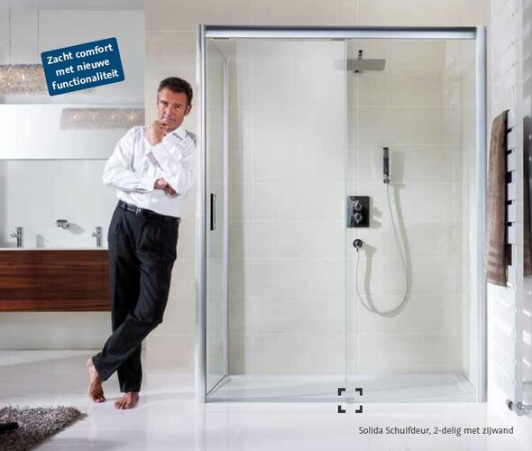 In het Trendjournaal van HSK ontvangen we het overzicht van de 'actuele noviteiten'. Bedenk hier zelf maar even het Duitse accent bij. Een staaltje ijzersterk vakwerk, daar staan onze oosterburen om bekend. In de vertaalde brochure is het direct duidelijk dat de brontaal Duits is. “Bekroonde producten met groot nut”, van ‘uw directeur’ die er demonstratief zijn bril voor afzet (!) zodat ie het zelf ook niet meer hoeft te zien. Onder hem poseert een man in pak richtig geil naast de moderne cabine die zacht comfort biedt. Je krijgt hem er helaas niet bij: alles voor ‘individueel doucheplezier’, aldus de brochure.