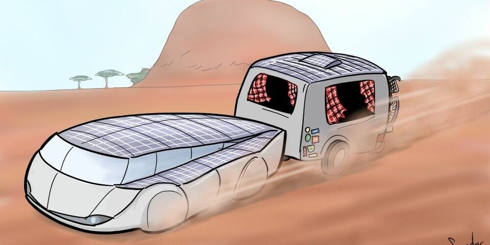 Cartoonist, karikaturist en illustrator Sandor Paulus verbeeldt in iedere Cursor een actuele kwestie aan de TU/e. Deze week: een team van de TU/e doet voor het eerst mee aan de Solar Challenge met een zonne-gezinsauto.