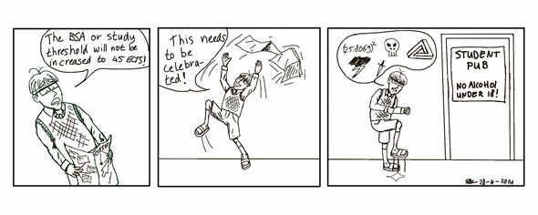 Studente Electrical Engineering Elles Raaijmakers probeert overal de humor van in te zien en dit met de wereld te delen in de vorm van cartoons en stripverhaaltjes. Deze keer: in januari gaat de alcoholgrens omhoog van 16 naar 18 jaar. De TU/e is niet van plan om minderjarigen op voorhand te weren uit de faculteitskroegen.