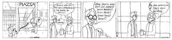Studente Electrical Engineering Elles Raaijmakers probeert overal de humor van in te zien en dit met de wereld te delen in de vorm van cartoons en stripverhaaltjes. Deze keer: de te laag hangende smartboards en krijtborden in de collegezalen van MetaForum zijn een dagelijkse bron van ergernis en studenten voerden daarom een ludieke actie.