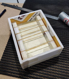 Dus besloot ik een doosje te maken waar de kleine motor in kan. We moesten eerst schetsen maken (die ik niet ga uploaden, omdat ik wil dat mijn oude ID-docenten denken dat ik nog wat kan). Dit gaf me al wat inzichten in het bouwen van het doosje en wat voor soort materialen ik daarvoor moest gebruiken. Ik wilde elastieken gebruiken, omdat dit de trilling van de motor zou kunnen tegengaan.