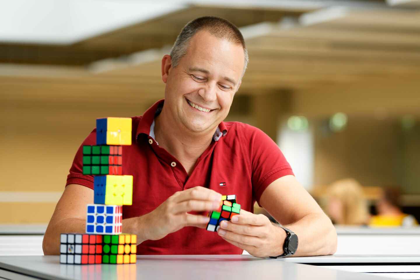 “Een groot deel van mijn werk is computationeel: het schrijven van algoritmes. Die algoritmische manier van werken en denken is precies ook de aanpak die je moet gebruiken bij het oplossen van de Rubik’s Cube: het probleem opbreken in deeltaken. Stap voor stap te werk gaan, zonder het einddoel uit het oog te verliezen.”