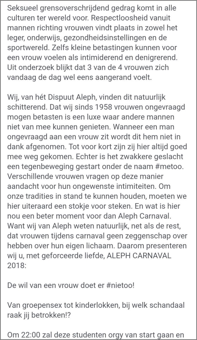 Het is een paar weken na ‘de kwestie Aleph’ als Cursor aan tafel zit met rector magnificus Frank Baaijens, collegevoorzitter Jan Mengelers en chief diversity officer Evangelia Demerouti. Dispuut Aleph en het Eindhovens Studenten Corps waarvan het deel uitmaakt, werden resoluut bestraft na een zeer vrouwonvriendelijke Facebook-aankondiging van Aleph’s jaarlijkse carnavalsfeest. Thema: (‘de wil van een vrouw doet er’) #nietoo.
