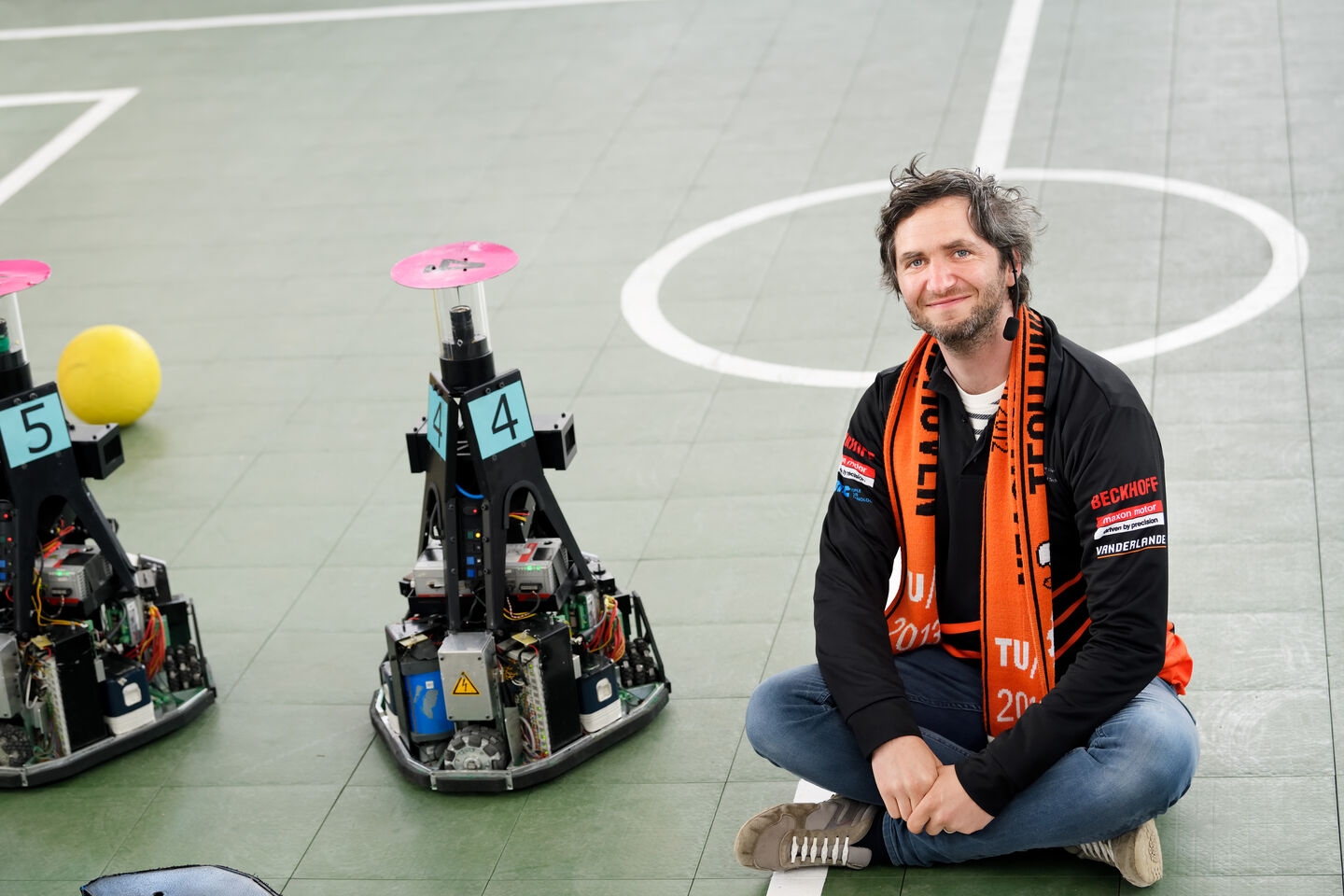 “Buiten Tech United is niemand bezig met outreach - het is een heel academische aangelegenheid. Tijdens de RoboCup in Brazilië wilde een speler van het nationale team tegen die robots spelen en dat hebben ze toen tegengehouden, ‘want misschien beschadigen die robots’. Dat vind ik onbegrijpelijk! Al moet je een verzekering van tienduizend euro afsluiten - je haalt daar een veelvoud uit aan outreach en onderzoek. Daar ligt een technologie-populariserende goudmijn. De krantenkop ‘Arjen Robben wint van robotvoetbalteam’ laat niemand liggen. Dan sta je overal in de media.”