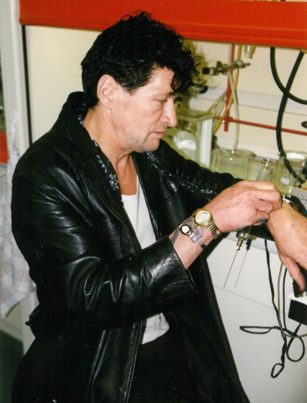 6 maart kwam en Brood ook. “Te laat natuurlijk, in een busje. Het was alsof de koning kwam.” De rockende kunstenaar had om een aparte kamer gevraagd waar hij zich kon voorbereiden, inclusief “een of ander blauw likeurtje, ik weet niet meer precies wat. Ik heb hem rondgeleid in het lab voor wat inspiratie. Hij zag een spuit, zette die tegen zijn arm en vroeg: ‘Kunnen jullie ook drugs maken?’. Ik zei: ‘Dat kan, maar dat doen we niet’”.