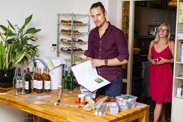 “Ik maak wijn van alles, behalve van druiven. (Dan mag het eigenlijk officieel geen wijn heten, hè?) Appelwijn, bananenwijn, theewijn, honingwijn, vlierbessenwijn, vlierbloesemwijn: mijn woonkamer staat er vol mee.” Lekker weer eens wat anders dan al die druivenwijn in de supermarkt. Maar die supermarktwijnen hoeven echt niet slecht te zijn. “Wanneer iets goede wijn is? Als je hem lekker vindt. Ik ben heel erg tegen dat decadente gezeur over wijn. Niet te moeilijk doen. Maar je moet zo’n fles wel met liefde openen. Niet de folie zomaar eraf scheuren, graag met een beetje aandacht. Wijn is wel verbonden met wat er omheen zit: de helft is beleving.”