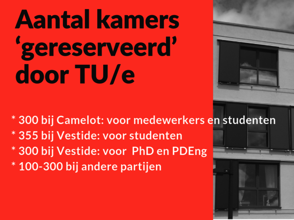 Groothuis benadrukt: “Het bemiddelen van de kamers voor de studenten via het International Office is een service, er worden geen garanties afgegeven op het vinden van woonruimte. Dit gaat volgens het first come first served-principe. Het aantal kamers dat wij in reserve hebben voor internationals, is niet toereikend. De universiteit heeft afspraken met verhuurder Camelot over zo’n 300 kamers die alleen mogen worden verhuurd aan medewerkers of studenten die binding hebben met de TU/e-campus, 355 kamers bij Vestide voor internationale studenten, circa 300 kamers bij Vestide voor internationale PhD’s en PDEng trainees en nog zo’n 100 tot 300 bij andere partijen.” Het aantal beschikbare kamers verschilt per jaar, onder andere omdat studenten ook het collegejaar erna nog in zo’n kamer wonen.