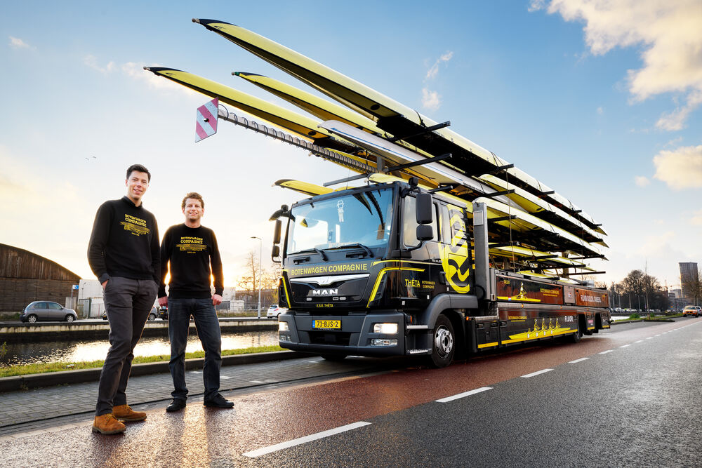 Een indrukwekkend beeld, de botenwagen van studentenroeivereniging Thêta. Dankzij een zelfontworpen systeem en toewijding van de leden, staat de vrachtwagen in het middelpunt van de vereniging. Edgar de Lange, technisch directeur van Thêta en Eef Meijerink, chauffeur, vertellen vol passie over ‘hun’ botenwagen.