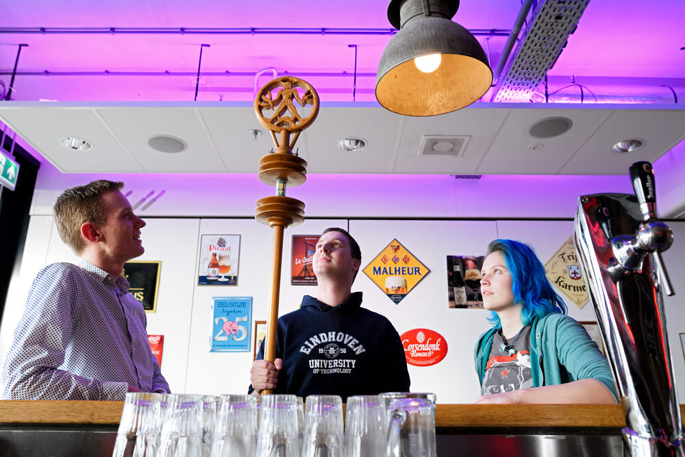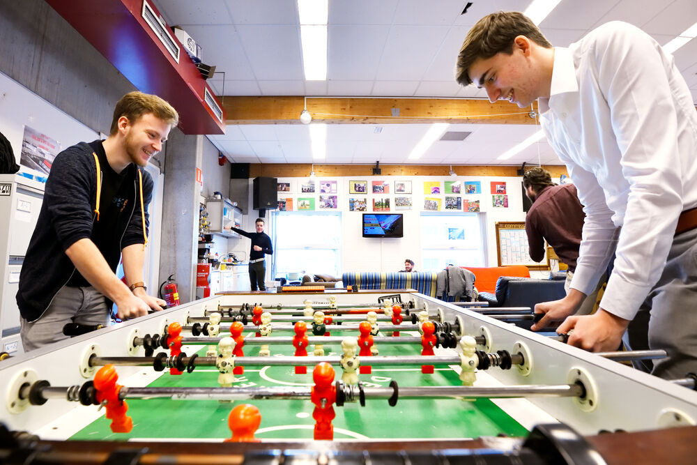 Betreed je de bestuursruimte van Intermate, dan is de kans groot dat je Janssen en Van Helvoort, allebei student Psychology & Technology, spelend met of tegen elkaar aantreft. Ze tafelvoetballen dagelijks op het pronkstuk van Intermate.