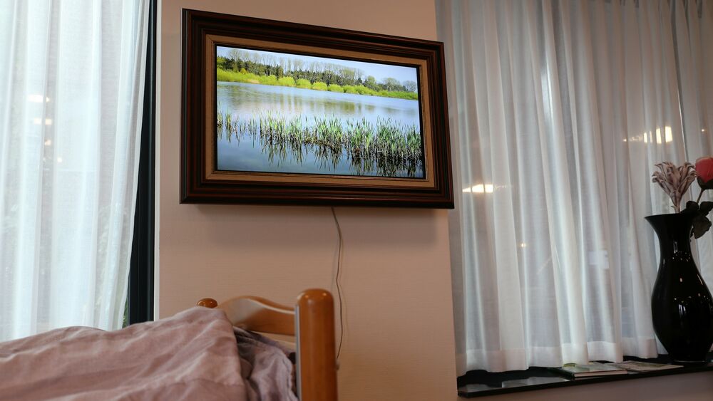 In de groepsruimte hangt een levend schilderij aan de wand. Een korte repeterende video toont tropische vissen in een aquarium. Afgewisseld met een idyllisch ven met wuivend riet. Het is een continu rustige scène die zorgt voor een ‘dynamische prikkel’. De rustige bewegingen in beeld hebben als doel de agitatie en onrust bij de bewoners te verminderen.