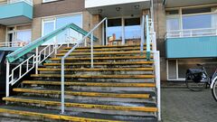 Tja, zo’n trap. Het moet ongetwijfeld een zeer fitte architect zijn geweest die deze entree heeft bedacht. Voor veel senioren een onneembare helling. Gelukkig is er aan de zijkant van het appartementencomplex een rolstoelbaan die geleidelijk naar het souterrain afloopt om vandaar met de lift omhoog te komen.