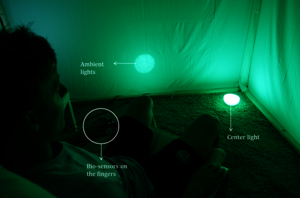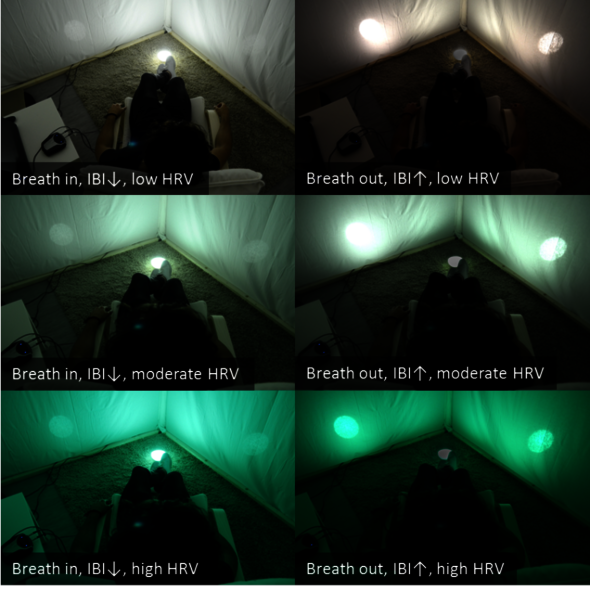 In de zoektocht naar de ideale proefopstelling blijkt verder dat het gebruik van geluid, vibratie of beweging in de Mindroom verstorend werkt. Daarom worden hartslag en ademhaling gekoppeld aan licht. Een omgevingslicht en een spotje op de proefpersoon, die in een comfortabele stoel zit. Funk: “Zodra je in- of uitademt, beweegt het licht mee. Van het centrum naar de rand van de ruimte en weer terug. Synchroon aan je ademhaling, dimt het licht en wordt het weer sterker. De kleur van het licht is afhankelijk van je relax-status. Voor deelnemers een krachtige ervaring en erg succesvol. Je krijgt biofeedback die er eerder niet was en die op de deelnemers ook zinnig overkwam. We kregen veel positieve reacties.”