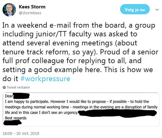Op Twitter (zie ook rechts) steunde hij onlangs ook openlijk een collega die in een reply-to-all had bedankt voor een reeks meetings in de avond, op uitnodiging van het faculteitsbestuur. “Zo nu en dan móet je flexibel zijn. Dat we het druk hebben, is een teken van groei en succes, dus iedereen zal wel eens iets ’s avonds of in het weekend moeten doen. Maar soms mag je ook aangeven dat hier je grens ligt - ook richting mensen die drie treden boven je staan. Het bestuur nam de boodschap trouwens direct ter harte.”