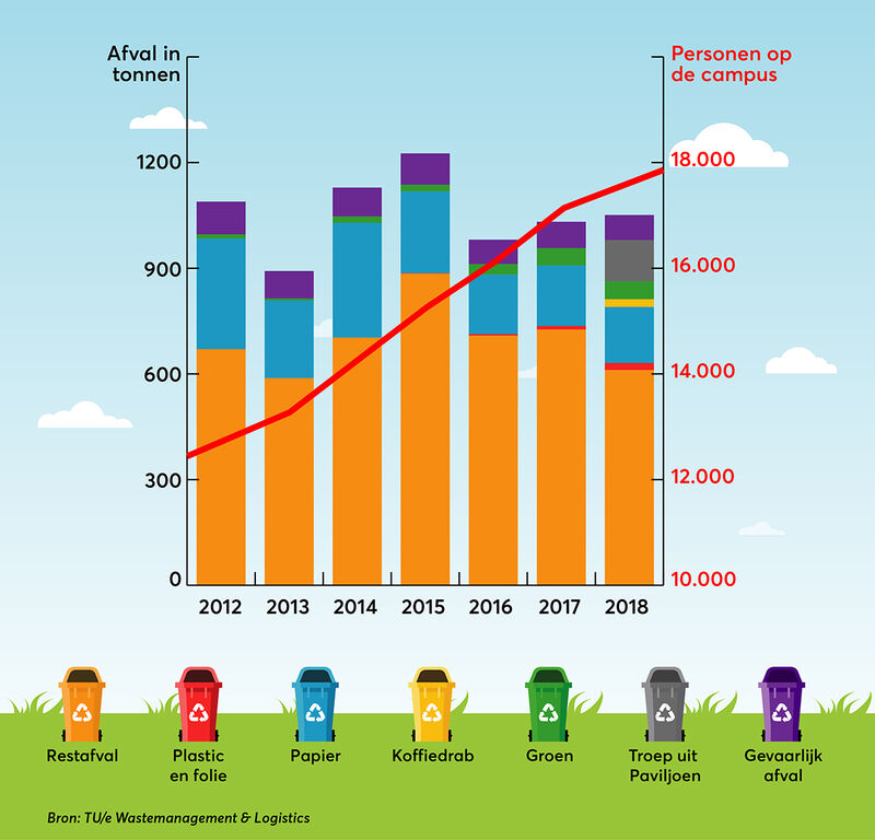 Wie niet probeert groen te doen, telt niet mee. Grondstoffen worden schaars en het nieuwe credo is hergebruik in plaats van recyclen. Een voorbeeld is het gebruik van re-usable biercups bij TU/e-feesten. Daarnaast moet het afval beter gescheiden worden. De doelstelling van de TU/e is om in 2020 minimaal zestig procent van al haar afval aan te bieden voor een ander eindpunt dan de verbrandingsoven.
