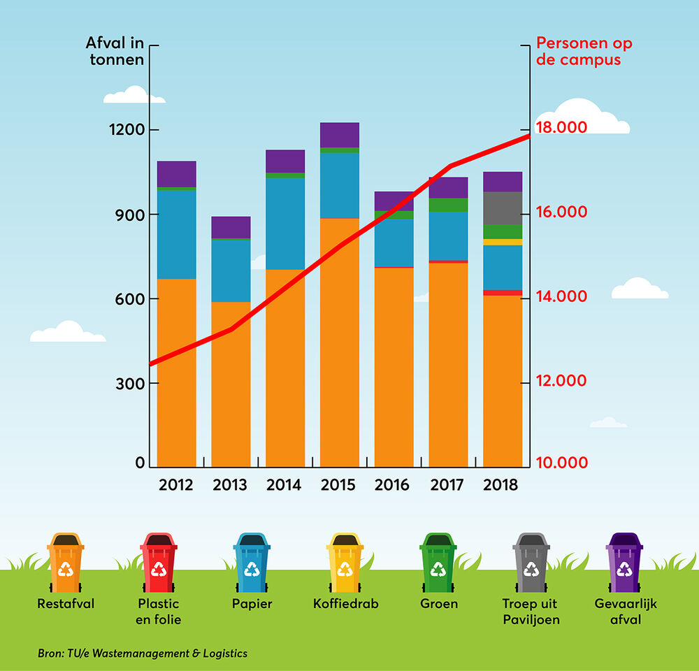 Het percentage restafval in de totale bulk materiaal dat in zogenoemde ‘kraakperswagens’ het TU/e-terrein verlaat, lijkt af te nemen. Volgens Mark Meijer, medewerker Wastemanagement and Logistics, is de ontruiming van het Paviljoen terug te zien in de infographic hierboven. Bij 2018 zie je een enorm grijs deel ('Troep uit Paviljoen') dat de kilo’s restafval van het Paviljoen weergeeft. Dat is al het materiaal dat niet mee mocht naar Atlas - denk aan mappen, plantenpotten, relatiecadeau's et cetera. “Het Paviljoen leegmaken was een lastige klus voor de medewerkers. Er was nauwelijks tijd en mankracht om goed te scheiden. We waren al blij dat het papier apart werd afgevoerd ”, zegt Meijer. Over het algemeen is de papierstroom afgenomen, valt Meijer op. “Aan de TU/e wordt al jaren het paperless werken gepredikt, dat zien we terug in het afval.”
