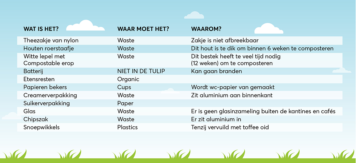 Wat mag waar? Een Tulip is een eenvoudig systeem. Bij twijfel gooi je je troep in het grijze zakje: het restafval. Waar gooi jij je houten roerstaafjes, de suikerverpakking, de creamerverpakking? Weet je waar het witte compostable bestek moet? Een theezakje van nylon of snoepwikkel? Check je antwoorden hier.