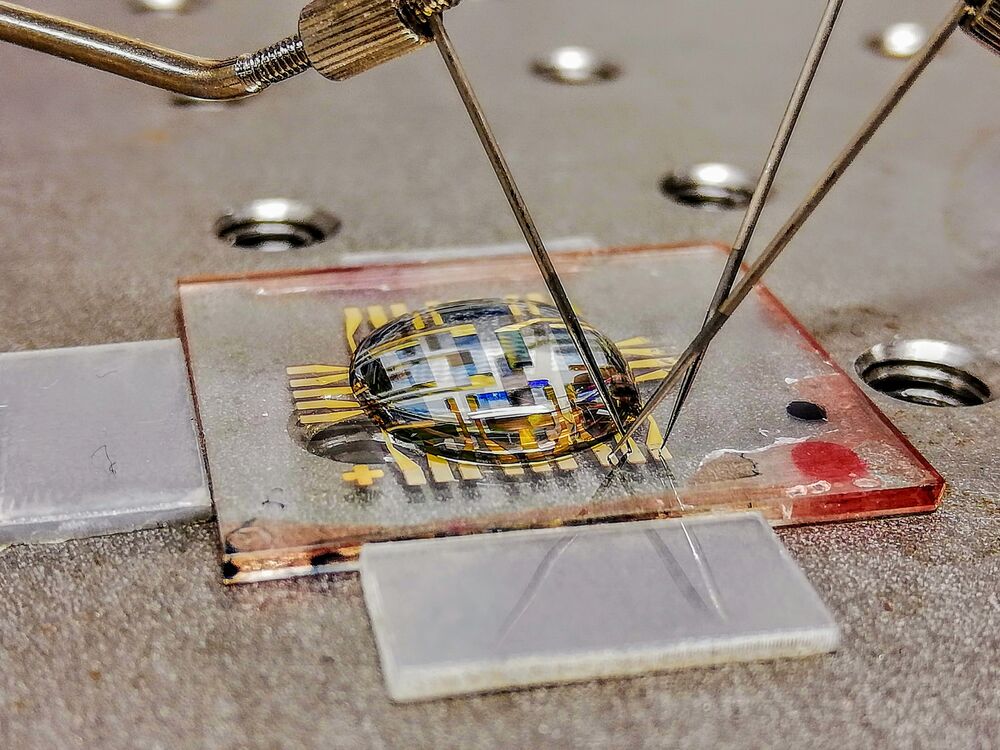 De TU/e loopt wereldwijd al jaren voorop op het gebied van fotonische chips. Stabile vertelt dat zij en haar collega’s onlangs een optisch neuraal netwerk hebben gedemonstreerd - met drie lagen van elk acht kunstmatige neuronen - op basis van een chip van indiumfosfide (InP) die ze zelf al in 2011 aan de TU/e had gemaakt. “Acht neuronen klinkt misschien niet als een indrukwekkend aantal, maar hiermee waren we de eersten met zoveel fotonische neuronen in een enkele laag. En ook met betrekkelijk weinig fotonische neuronen kun je enorm hoge rekensnelheden bereiken, omdat signalen gelijktijdig verwerkt kunnen worden. We komen op acht miljard bewerkingen per seconde!”
