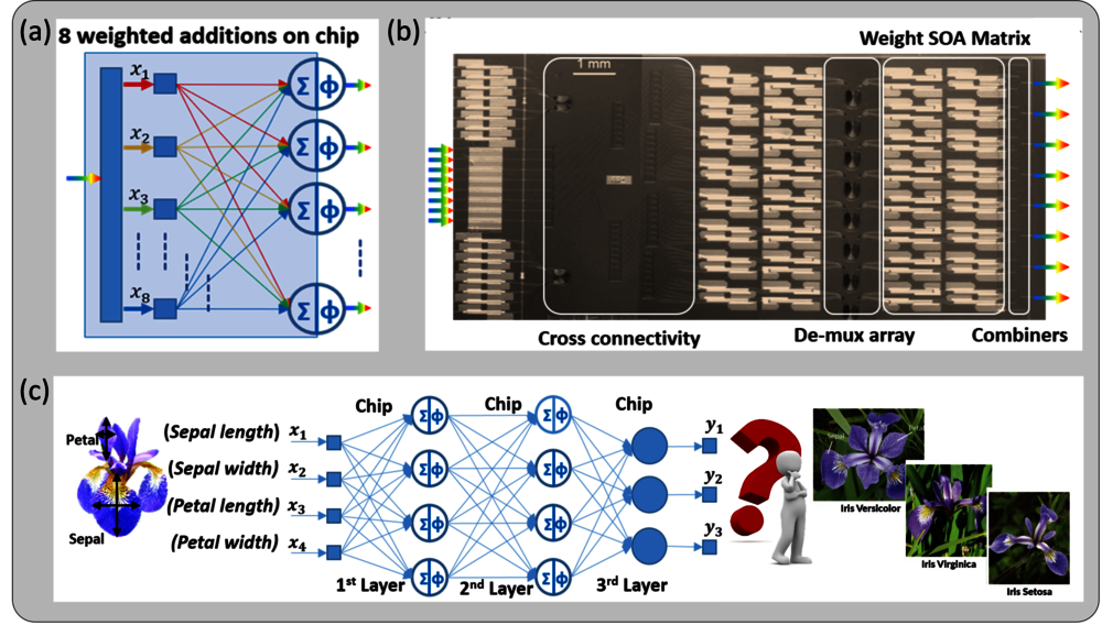 Met haar collega’s liet Patty Stabile vorig jaar zien dat je met zo’n fotonisch neuraal netwerk al aan beeldclassificatie kunt doen door het netwerk los te laten op een klassiek voorbeeld van classificatie: het indelen van afbeeldingen van irissen (de bloemen) in drie categorieën. Daarbij bleek dat de meeste fouten ontstonden bij het omzetten van fotonische naar elektronische signalen en vice versa. “Ons doel is daarom om alle berekeningen zoveel mogelijk in het optische domein te doen om zo te komen tot een volledig optische classificatie. Het ‘trainen’ van het netwerk voor die taak, dat voorafgaand moet worden gedaan, kan helaas nog niet met een volledig fotonisch netwerk, omdat er nog geen betrouwbaar optisch geheugen bestaat. Voor dat trainen kun je echter al wel optische en elektronische methodes combineren.”