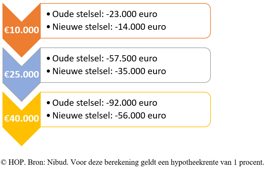 Een rekenvoorbeeld met die gemiddelde studieschuld van 25.000 euro: bij een hypotheekrente van 1 procent krijgen studenten uit het oude leenstelsel een mindering van 57.500 euro op hun maximale hypotheek. Studenten uit het nieuwe leenstelsel krijgen 35.000 euro minder hypotheek, omdat hun maandelijkse aflossingsbedrag lager is.