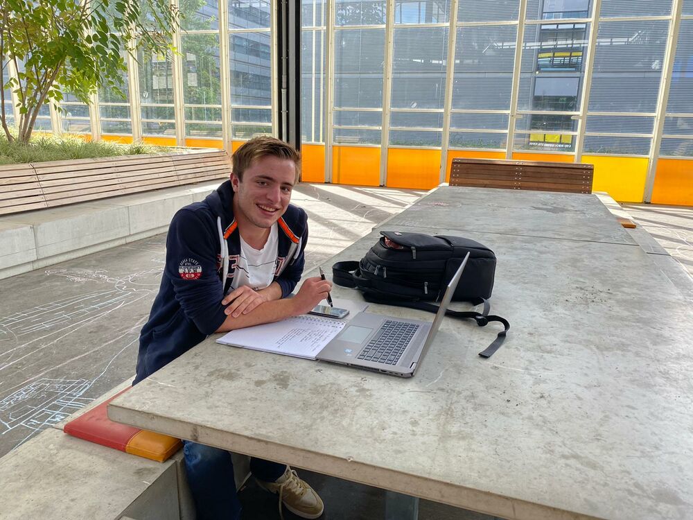In de Markthal treffen we Niek Durlinger, bachelorstudent Werktuigbouwkunde, aan een picknicktafel. “Ik ben nog even een college aan het kijken voordat ik zo een meeting heb hier. Het is mijn allereerste keer op de campus: ik ben net met mijn studie begonnen.”