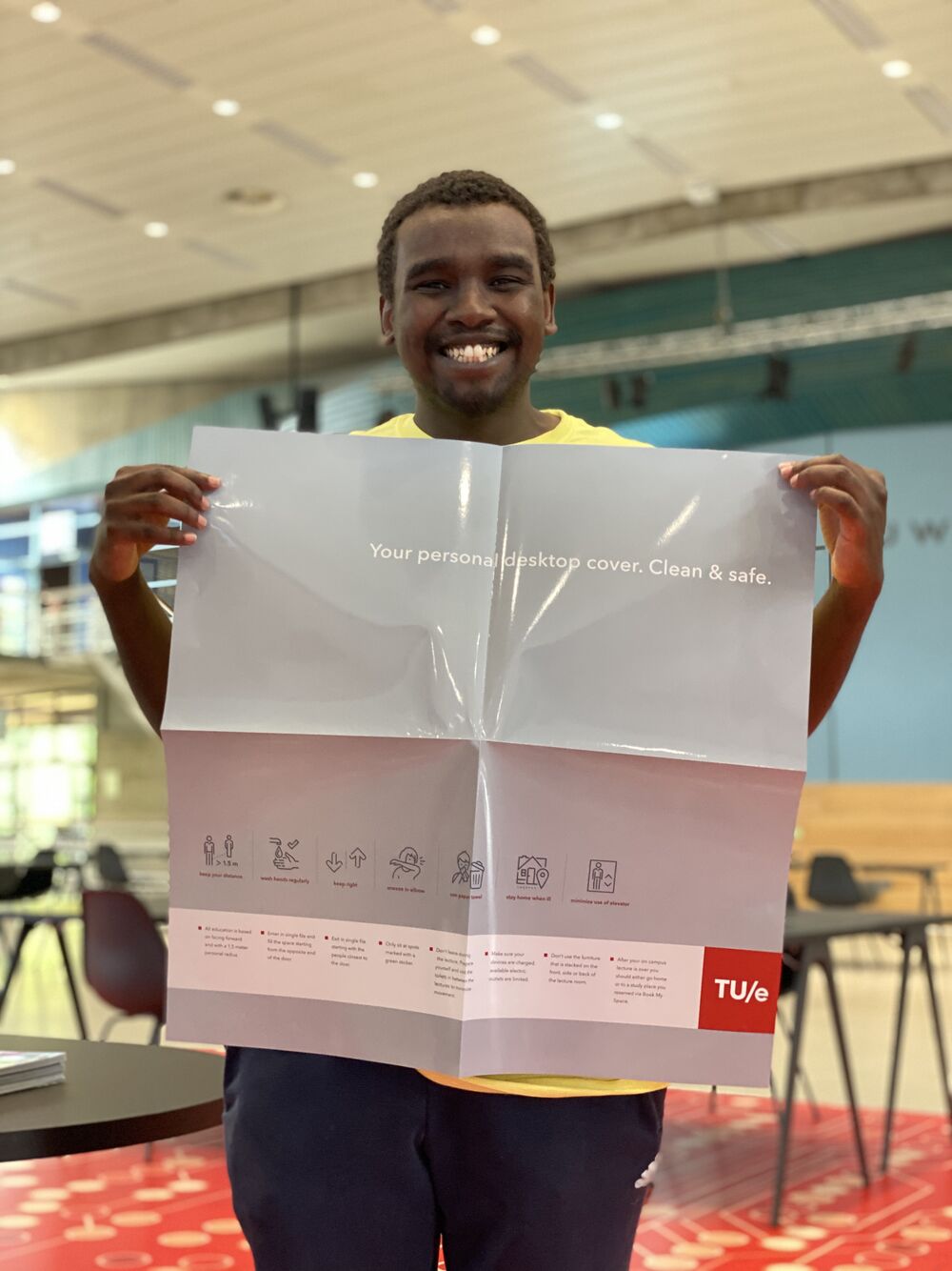 Studenten die een studeerplek hebben geboekt via BookMySpace, kunnen zich bij hem of een van zijn collega’s melden. Daarbij krijgen ze een soort grote placemat die ze op de werkplek kunnen leggen, zodat ze altijd op een schone werkplek kunnen werken. De placemat is gemakkelijk te reinigen en mag de student nadien houden. “Er zijn vandaag nog niet zoveel studenten in het Auditorium, maar ik houd goed het overzicht. Om twee uur word ik afgewisseld door een andere coach, want we werken in shifts. Ik doe dit als een bijbaan naast mijn studie Automotive. Natuurlijk is het fijn zo wat bij te verdienen, maar ik doe het ook voor de veiligheid: mijn oom heeft corona gehad en hij is gelukkig hersteld, maar dat maakt je wel extra bewust van het belang van de maatregelen.”