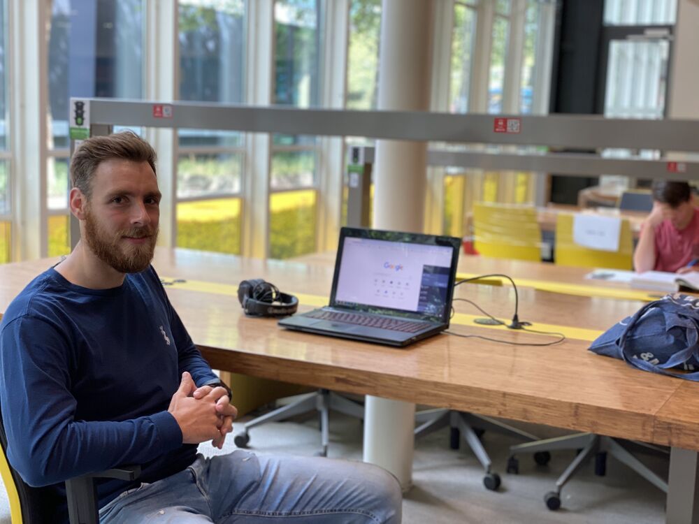 Samen met Alexander Ramp lopen we de trap af naar de studieplekken in de bibliotheek in MetaForum. De masterstudent Sustainable Energy Technology is sinds maart niet meer op de campus geweest: “Vanochtend heb ik college gehad in Atlas. Met zo’n vijftien studenten zaten we in een zaaltje terwijl anderen via een livestream meekeken. Er was nog een extra zaal beschikbaar als er opgeschaald moest worden.”