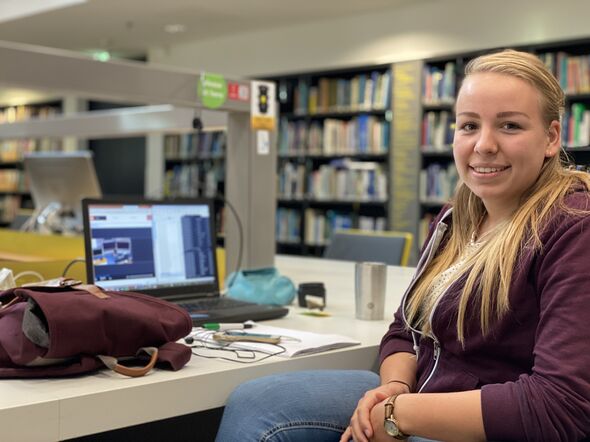 Melanie Hendriks, bachelorstudent Werktuigbouwkunde, treffen we in de bieb, waar ze “een poging doet tot college kijken en werken aan mijn BEP. Ik ga weinig naar colleges toe, ik doe veel aan zelfstudie en kijk naar opgenomen colleges als het nodig is." Dat deed ze in coronatijd bij haar ouders, maar nu ze terug in Eindhoven is, vindt ze het fijn dat MetaForum weer beschikbaar is. "Het is hier nu nog lekker rustig.”