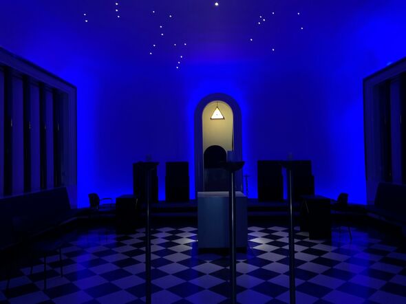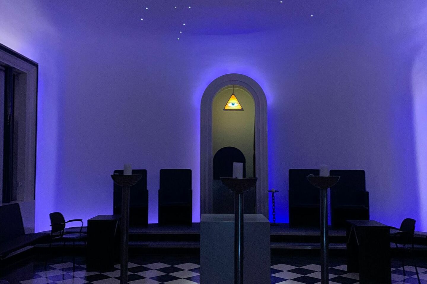 ‘Wie klopt daar als profaan aan de tempelpoort?’ In dit geval een vrouw van goede naam, die wenst bij de vrijmetselaars binnen te kijken. De leden kennen een speciaal wachtwoord om de deuren te openen. Als de deuren dan toch -uitzonderlijk-zonder wachtwoord opengaan voor Cursor, kijken we in een zwart-wit geblokte zaal met banken aan de zijkant, een altaar achterin en een sterrenhemel. Het alziend oog boven het altaar staart ons aan. “Dat kun je wellicht zien als je eigen morele kompas om je daden te beoordelen”, zegt vrijmetselaar Chris Franken. Hij benoemt dit bewust zo als een mogelijke betekenis, maar daarover verderop meer.