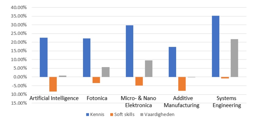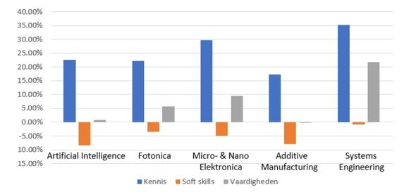 “Het onderwijs zal ook steeds meer richting challenge based learning gaan”, zegt Van de Weijer. “Ik denk dat het toekomstige curriculum steeds meer lijkt op wat de studententeams doen, en minder ‘rijtjes uit je hoofd leren’, die informatie kun je online wel vinden. Deze tijd vergt andere, meer breder georiënteerde kennis, al moet je wel kunnen laten zien dat je in staat bent de diepte in te duiken.” Uit een onderzoek van Brainport blijkt dat er bij AI-vacatures een grote toename is in de vraag naar kennis (‘wat weet ik’), een zeer kleine toename naar vaardigheden (‘wat kan ik’) en een duidelijke afname in de vraag naar soft skills die in het onderzoek worden gedefinieerd als ‘wie ben ik’. Volgens het onderzoek is dus juist die kennis erg belangrijk in een werknemer.