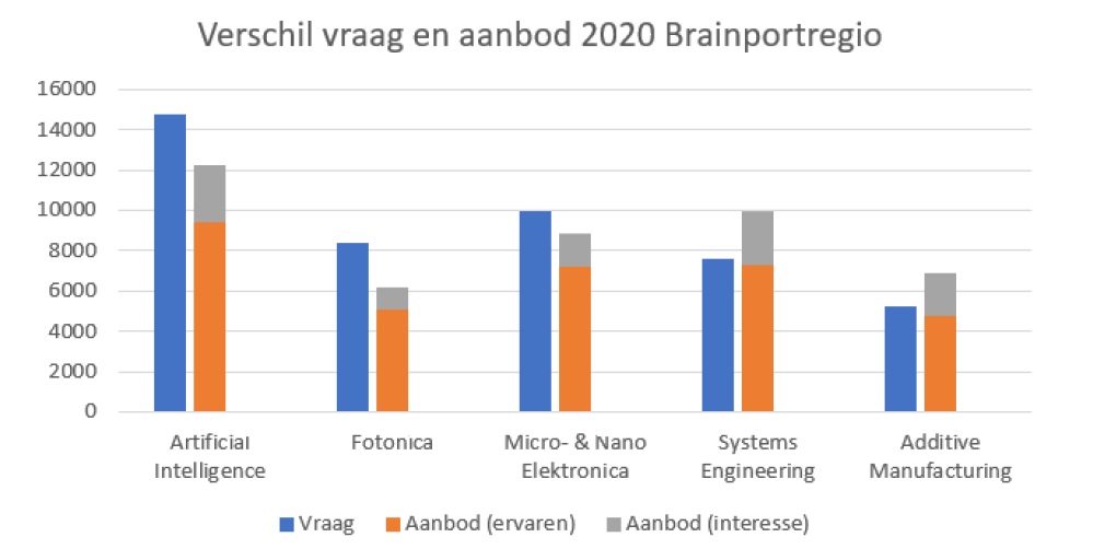 Van de vijf belangrijkste technologieën, de zogenaamde sleuteltechnologieën in deze regio, steekt AI er duidelijk bovenuit met veruit de meeste vacatures. De groei in Brainport op het gebied van AI-vacatures was elk jaar groter dan in de rest van Nederland. Een kanttekening bij de cijfers is dat sommige vacatures overlappen en dus onder meer technologieën vallen. Dat illustreert tegelijkertijd ook de kansen van mensen met kennis van AI; die wordt ook gevraagd in functies die niet direct onder de noemer AI vallen. Brainport verwacht dat het huidige tekort aan werknemers met een AI-achtergrond zal doorzetten de komende jaren. Van de Weijer verwacht dat ook: “Ik denk dat de mismatch op de arbeidsmarkt qua behoefte en aanbod van werknemers met AI-achtergrond alleen maar zal groeien de komende tijd. We moeten een basis creëren. Dat wil niet zeggen dat al die mensen diehard met AI moeten gaan werken, maar het laat de behoefte aan een bepaald begripsniveau en flexibiliteit zien.”
